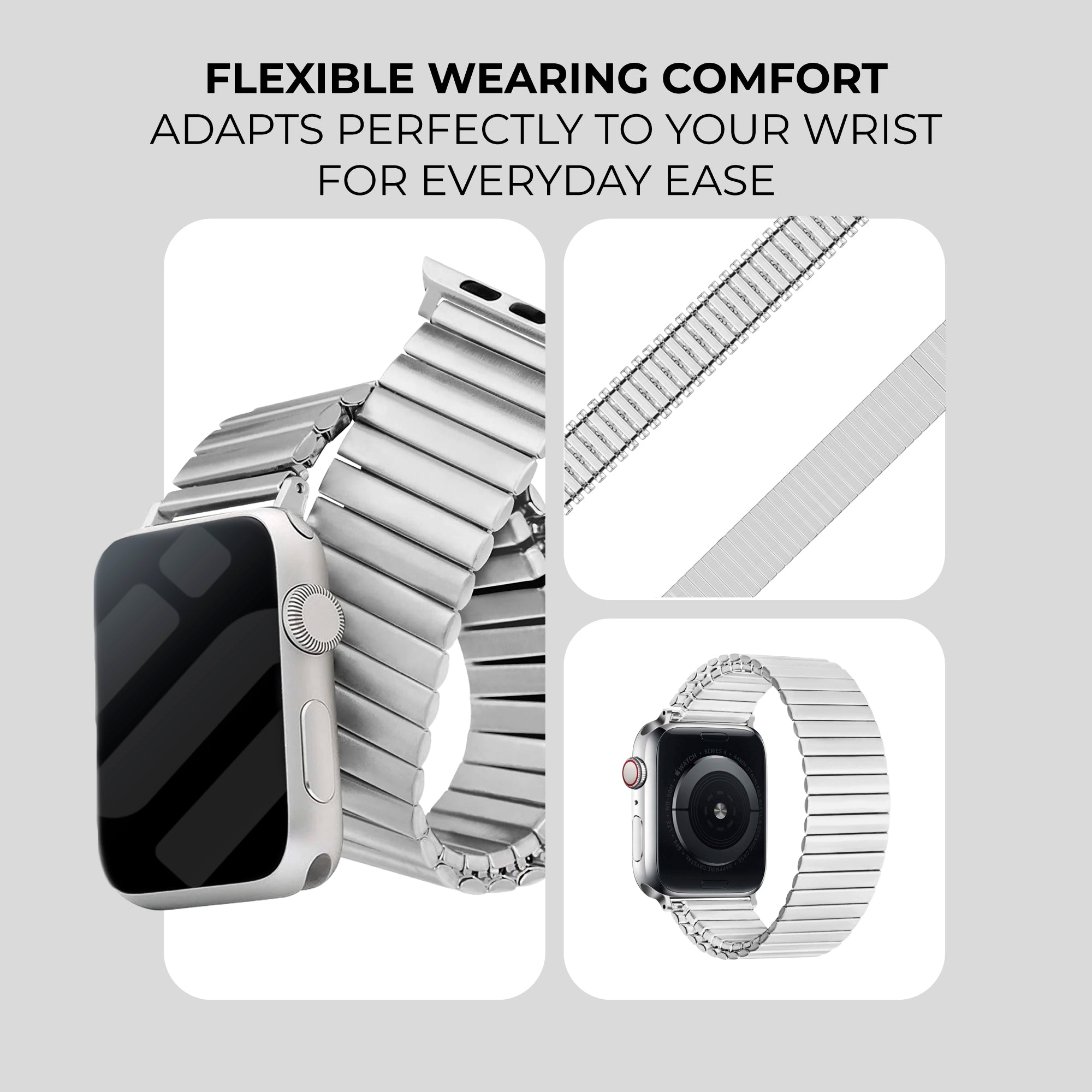 A silver elastic band for the Apple Watch