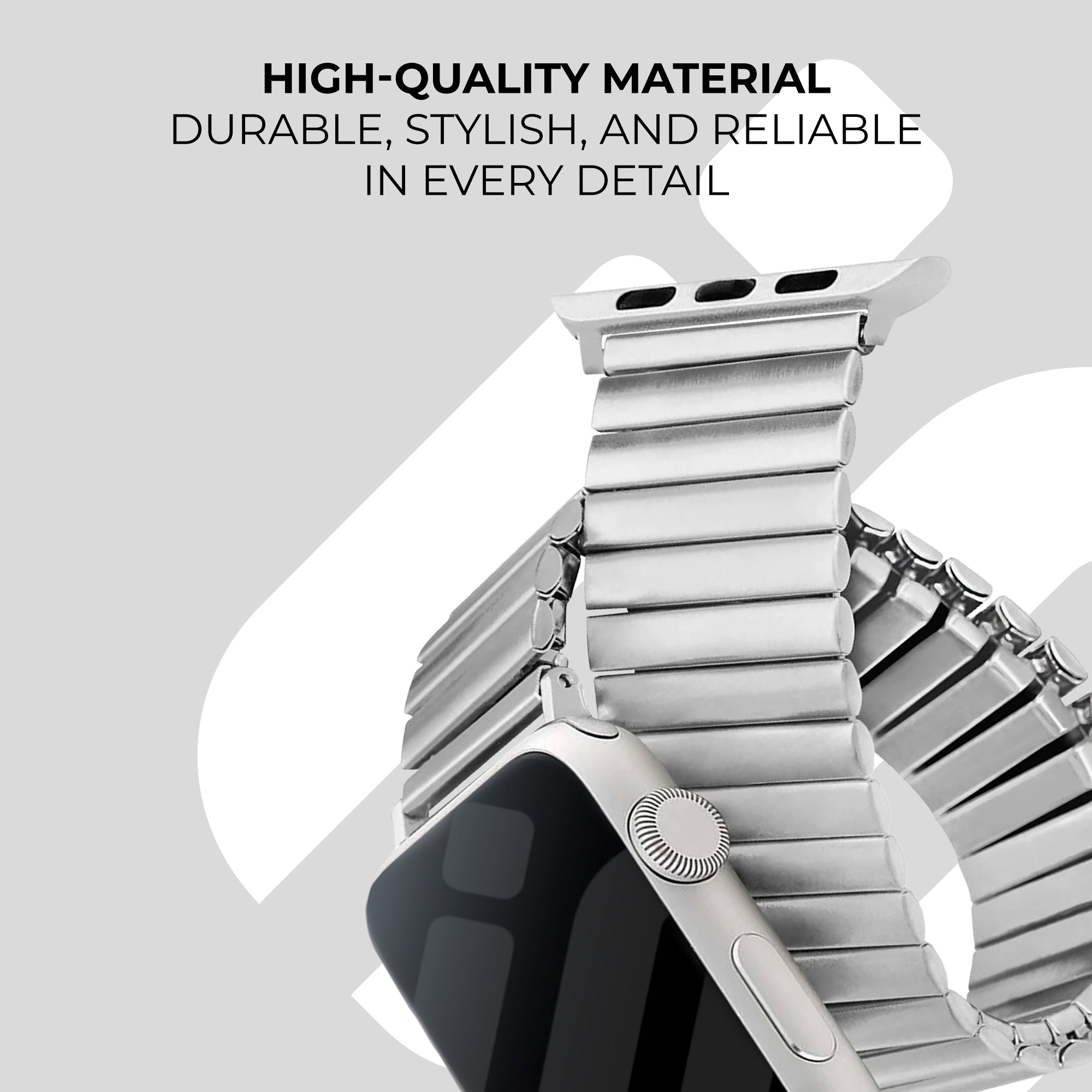 This Apple Watch steel stretch band is a beautiful band made of stainless steel that fits comfortably around the wrist. The steel links are connected with an elastic band, which makes the band stretch well. So it always fits well on the wrist. In this way, you can easily put on and take off the strap. There are four fashionable colours to choose from.