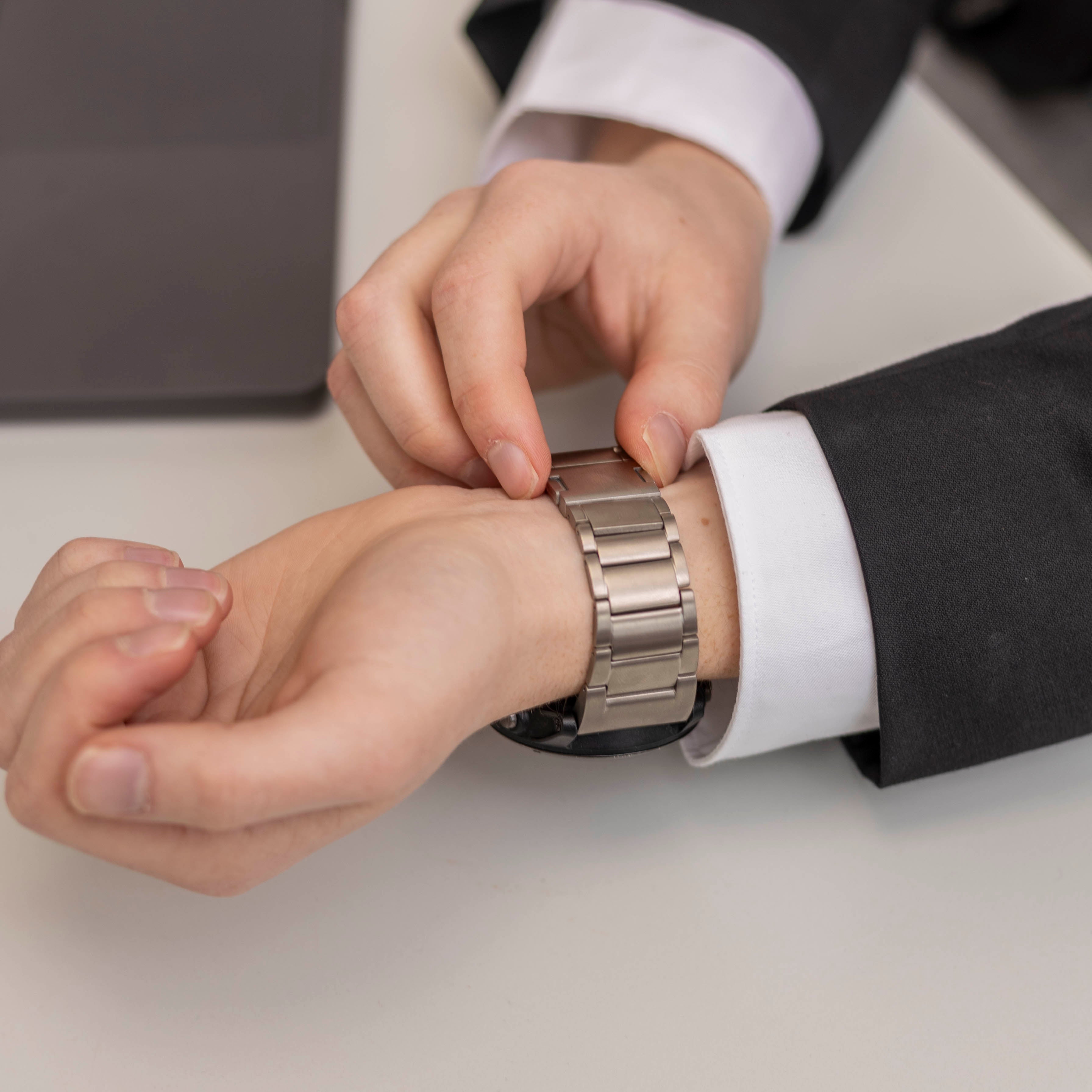 El titanio es una excelente opción para correas de reloj, ya que es muy ligero, extremadamente resistente y le da un aspecto clásico a tu reloj inteligente. Es la opción más premium para elegir en una correa de reloj inteligente.